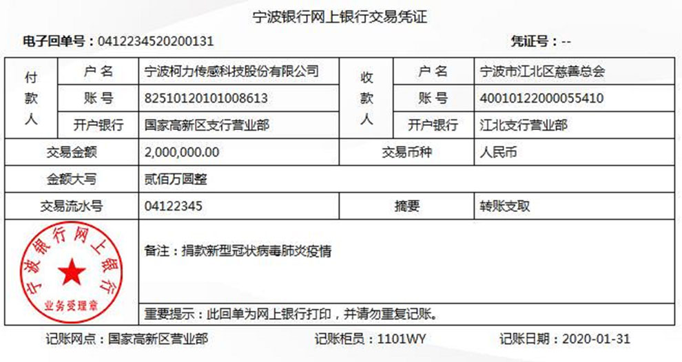 寧波柯力傳感科技股份有限公司捐200萬元支援疫情防控與救治
