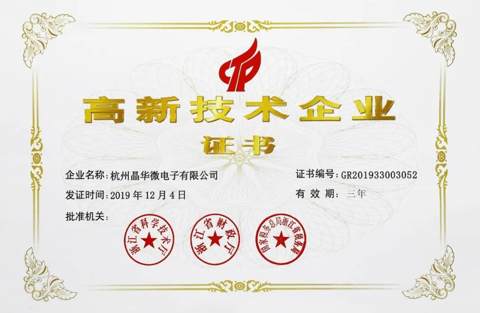杭州晶華微電子有限公司再次獲評“高新技術(shù)企業(yè)”